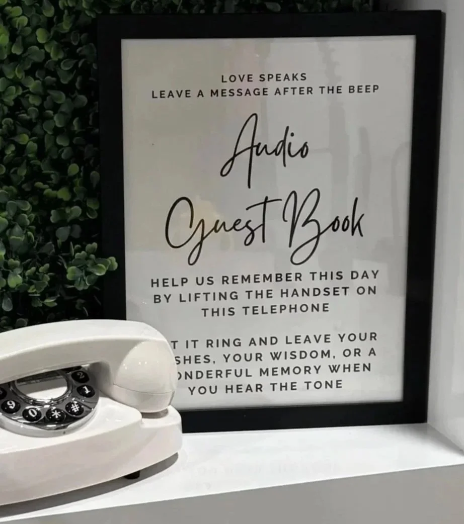 WE ALSO PROVIDE 2 FRAMED SIGNS THAT TELL GUESTS HOW TO USE THE AUDIO GUESTBOOK. WE OFFER A BLACK FRAME AND A GOLD FRAME TO MATCH ANY AESTHETIC!